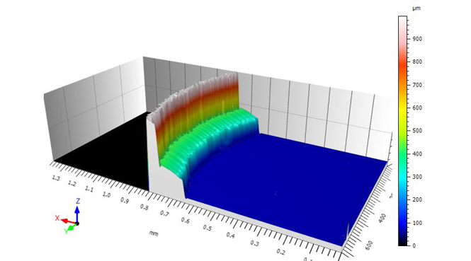 在点胶工艺中生成的胶水小球目前只能通过视觉系统检验。在生产中必须保证点胶路线是连贯和稳定的,而通过色散共焦测量传感器系统就能够控制许多质检标准中的很多参数。胶水小球相对于其他结构必须安置在正中间。在点胶起始和结束的异常的材料积聚能被检测出来。光谱共焦测量就连缺口也能被检测到。 由于胶水自身特性:液体,成型特性:带有弧形,材料特性:透明或半透明。采用光谱共焦传感器,最高采样频率可达10K/S,适合在线测量方式使用。